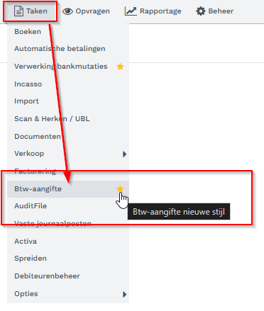 Je vindt het nieuwe Btw-aangifte programma onder Taken | Btw-aangifte