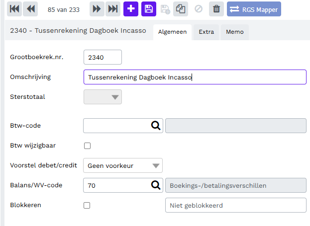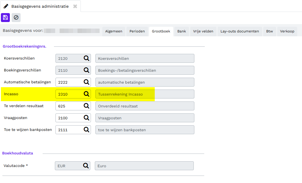 Vul in de tab “Grootboek” de grootboekrekening “Incasso” in. Deze tussenrekening wordt gebruikt om het saldo van alle incasso-opdrachten tegen te boeken.