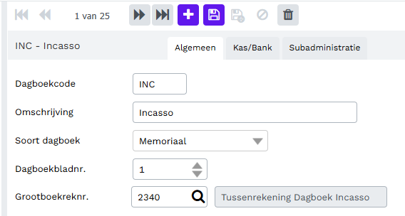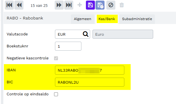 - Controleer bij het dagboek voor de bank (die je wilt gebruiken voor incasso-opdrachten) of het BIC- en IBAN-nummer is ingevuld in de tab Kas/Bank.