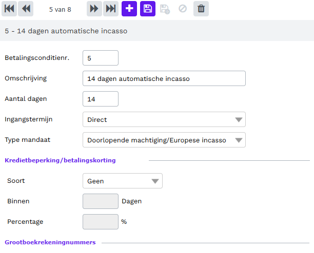 Maak voor elk gewenst incassotype een aparte betalingsconditie aan met het juiste Mandaat-type. (Kredietbeperking en betalingskorting is niet mogelijk in combinatie met incasso).