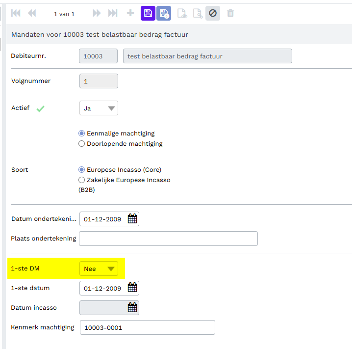 - Maak via de button Mandaten in de knoppenbalk het gewenste mandaat aan en zet hierbij de optie Actief op “Ja” en kies bij “1-ste DM” voor de waarde “Nee”.