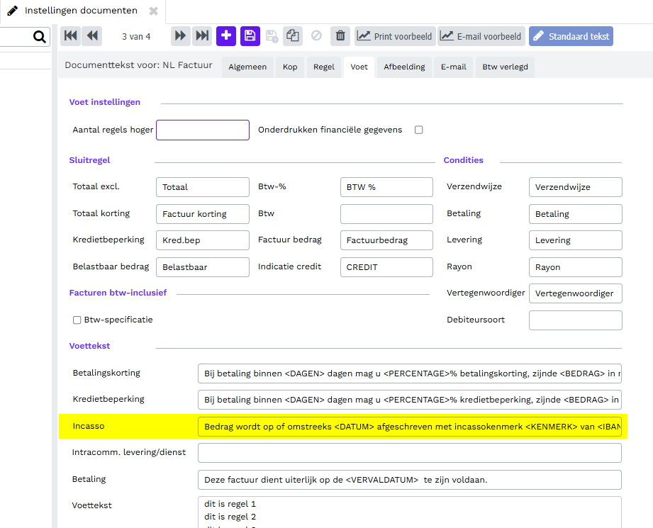 Vul in de tab Voet de gewenste voet-tekst in voor incasso-facturen.