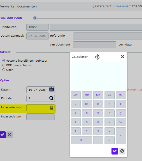 Bij het afsluiten en verwerken van de factuur kan je een incasso-termijn (aantal dagen) ingeven, waarmee de incassodatum van de factuur wordt bepaald.