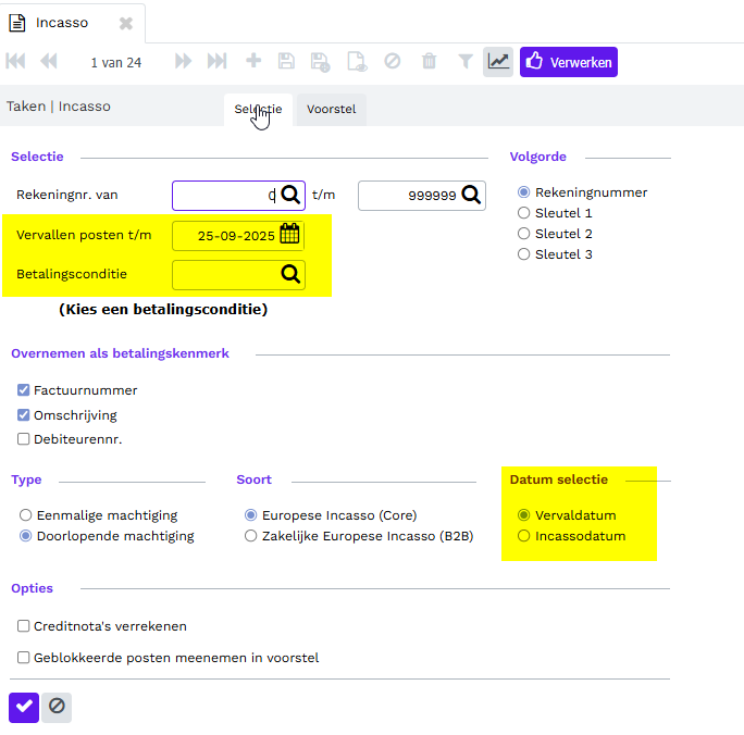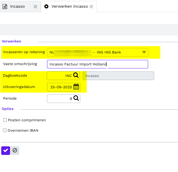 - Klik dan op de groene vink om het incasso-voorstel aan te maken.