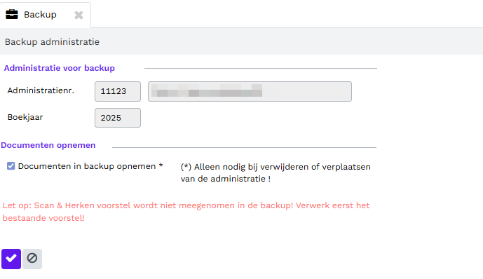 Vink het selectie vakje "Documenten in back up opnemen" aan. Dit is in principe alleen nodig als je de administratie verplaatst ( naar een ander klantnummer) of verwijderd, maar Minox adviseert gebruikers documenten altijd in de back up op te nemen.