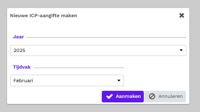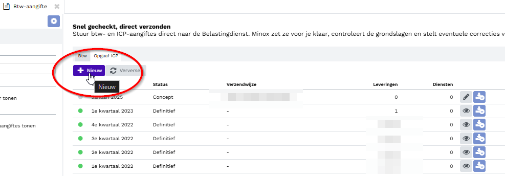 Klik bij Taken BTW aangifte via het Tab "Opgaaf ICP " op de knop "Nieuw"