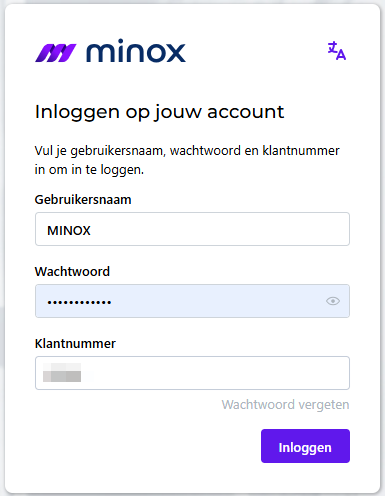 Zodra je op "Inloggen" klikt, wordt het inlogscherm van Minox zichtbaar.