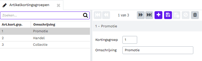 Aan de linkerkant van het scherm, wordt de lijst van de Artikelkortingsgroepen getoond met de volgende informatie: