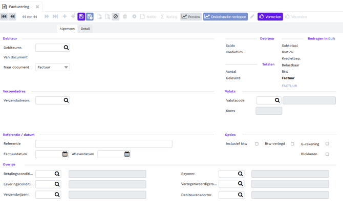 In het tabblad Algemeen wordt de debiteur gekozen en wordt een aantal opties geselecteerd.