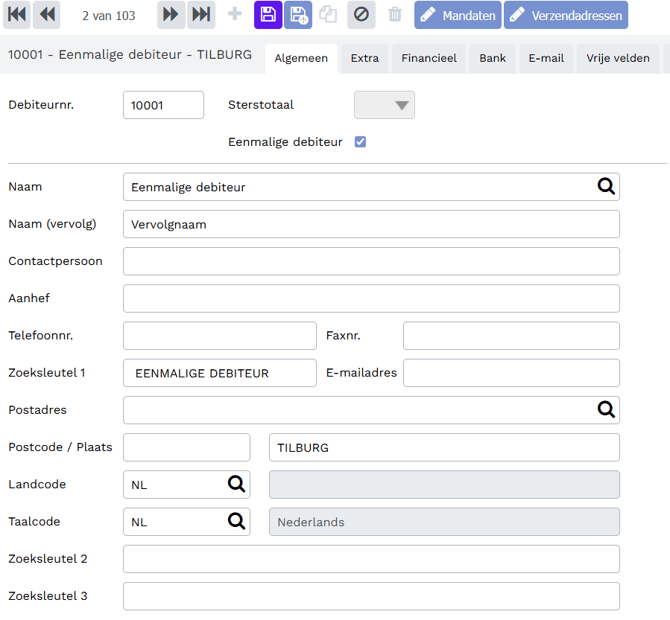 Indien het debiteurennummer van een eenmalige debiteur wordt gebruikt, verschijnt direct een venster voor het intoetsen van de eenmalige debiteurgegevens:
